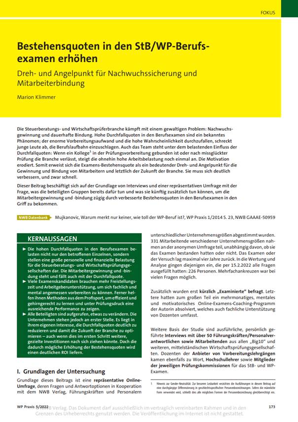 Bestehensquoten in den StB/WP-Berufsexamen erhöhen – Die Essenz aus 226 Umfrageteilnehmern und 50 Fach-Interviews. |